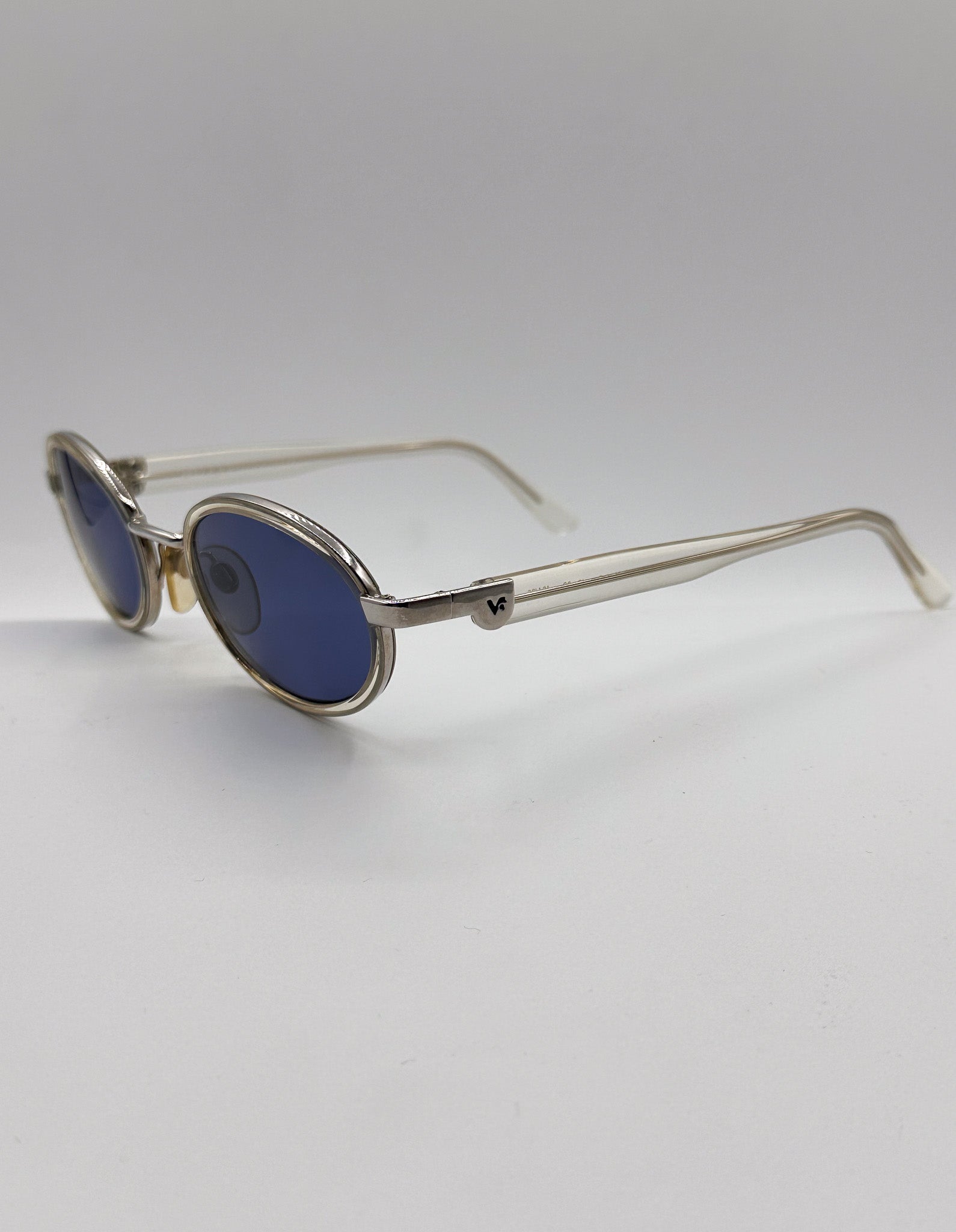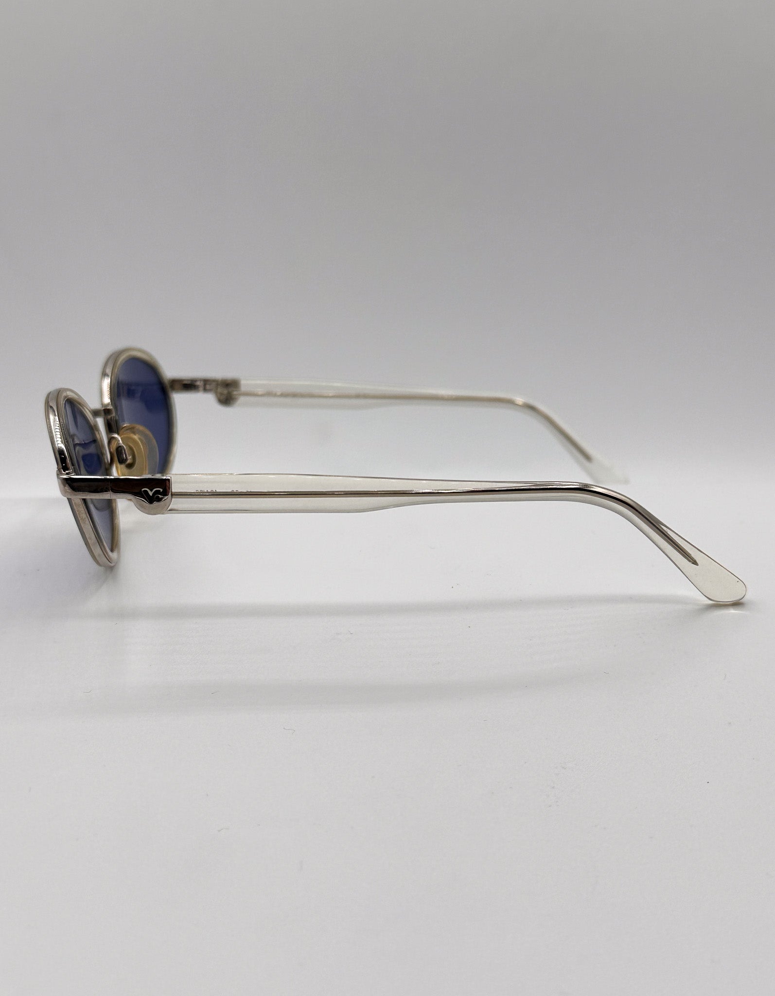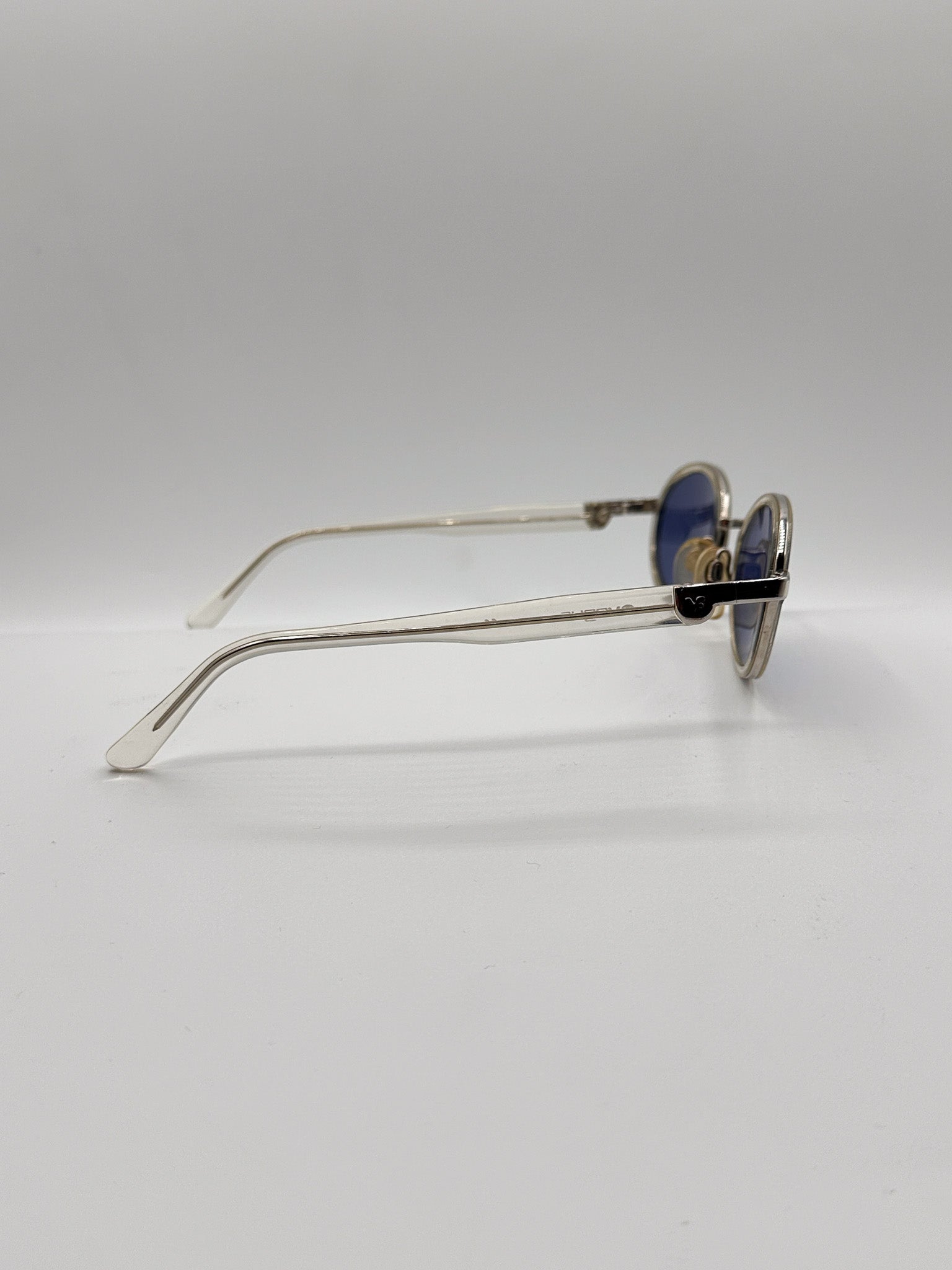 1980s Vogue frame, made in Italy. Clear acetate frame with oval lenses. Newly replaced blue lenses. UV-protected and scratch resistant.