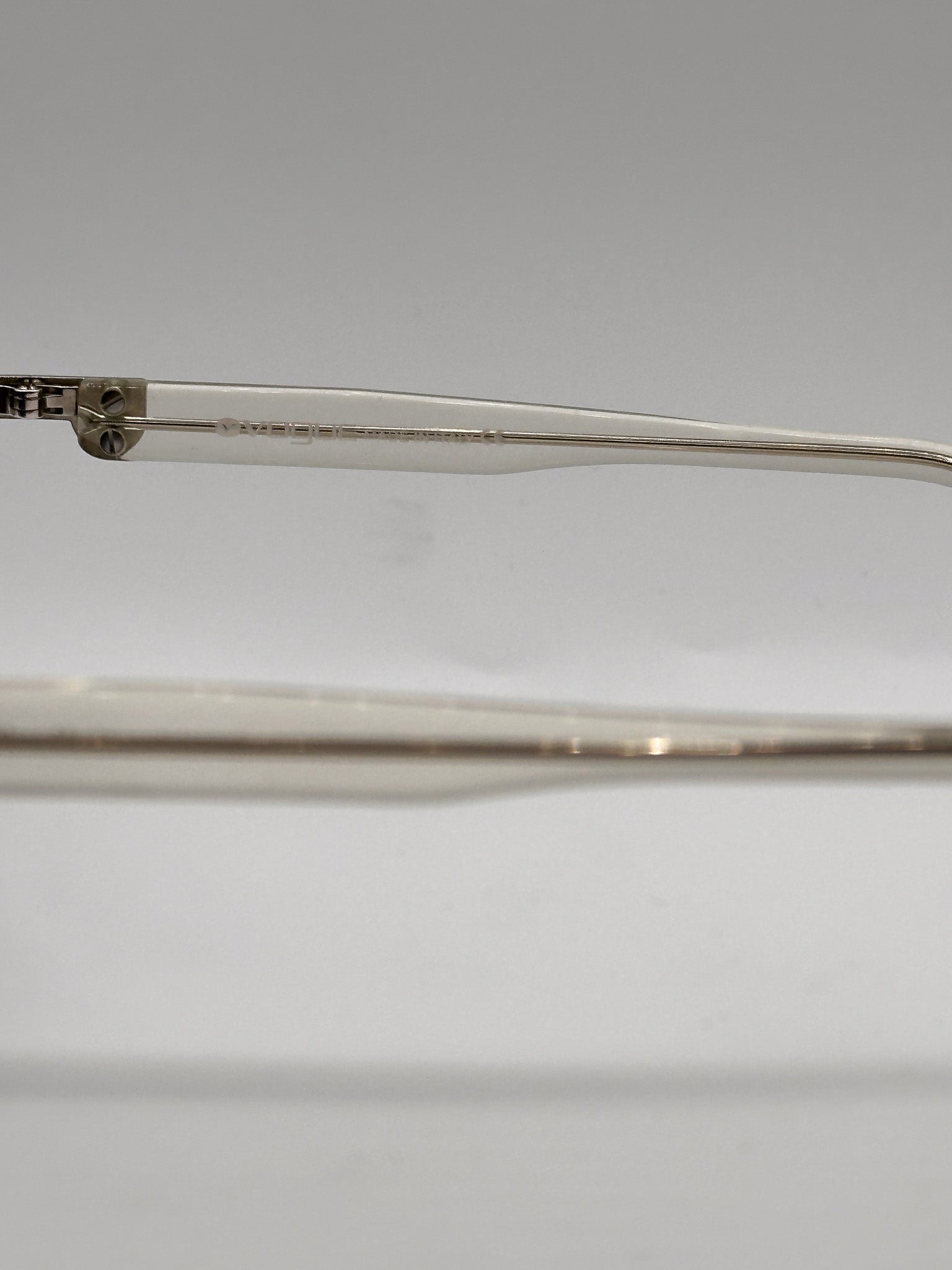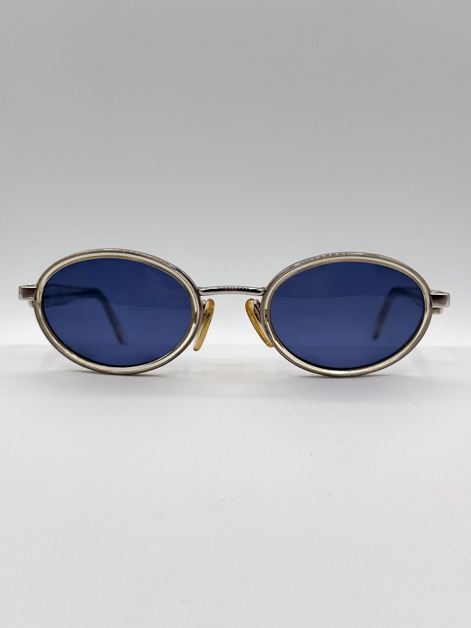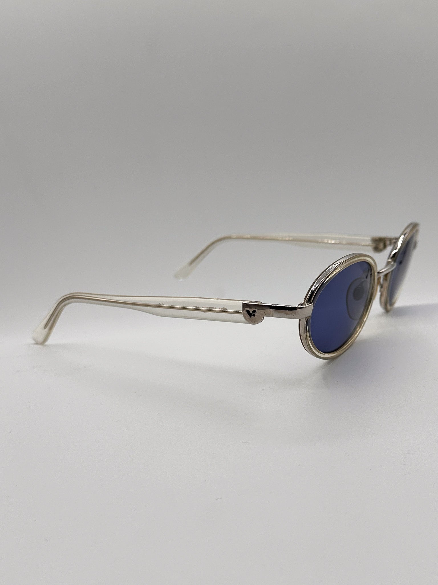 1980s Vogue frame, made in Italy. Clear acetate frame with oval lenses. Newly replaced blue lenses. UV-protected and scratch resistant.