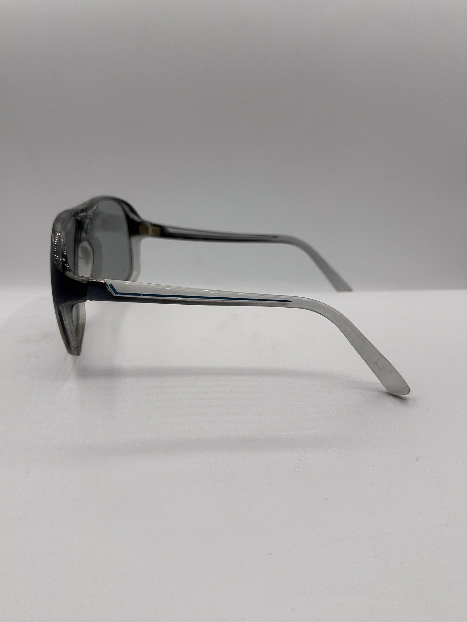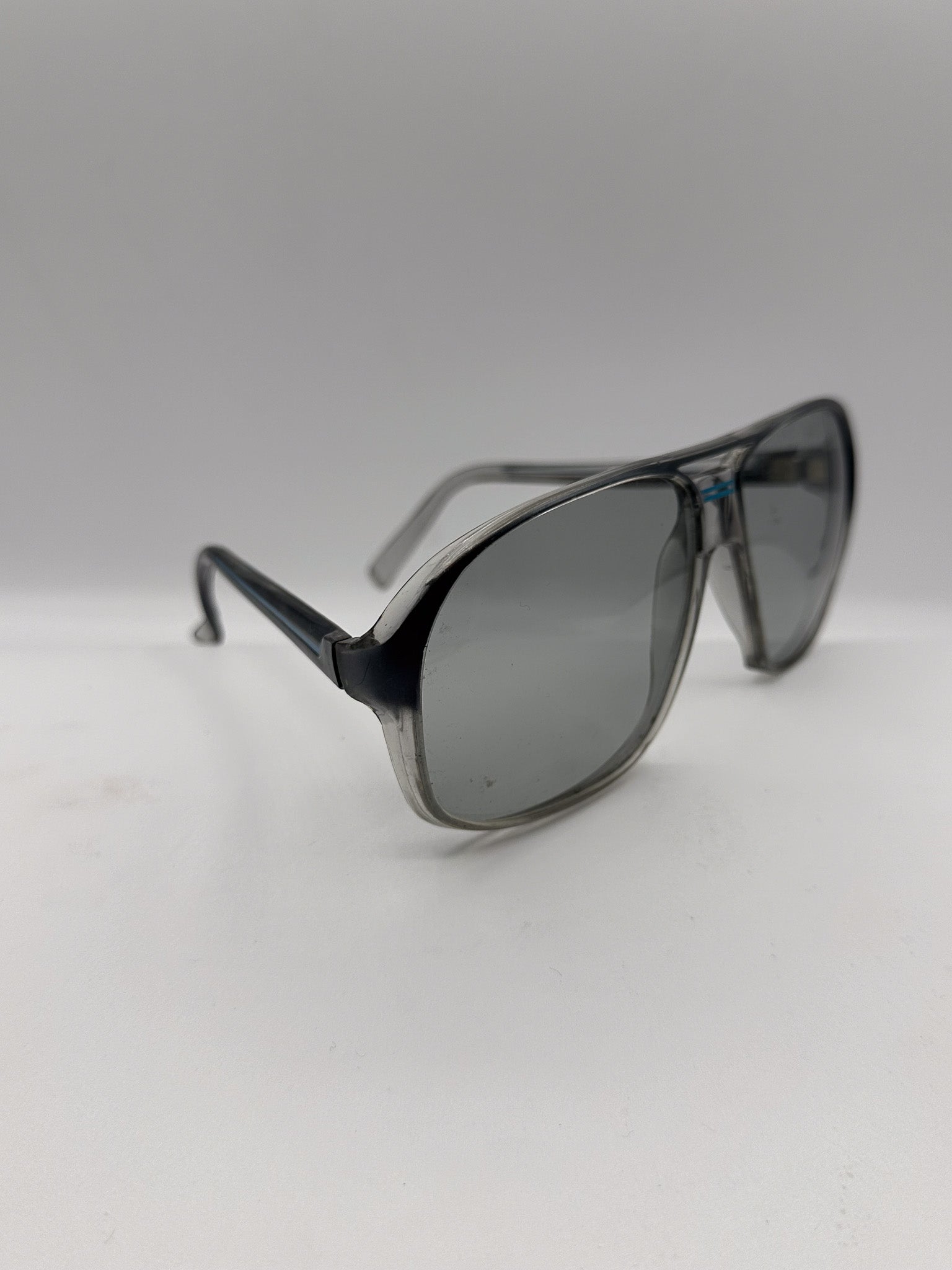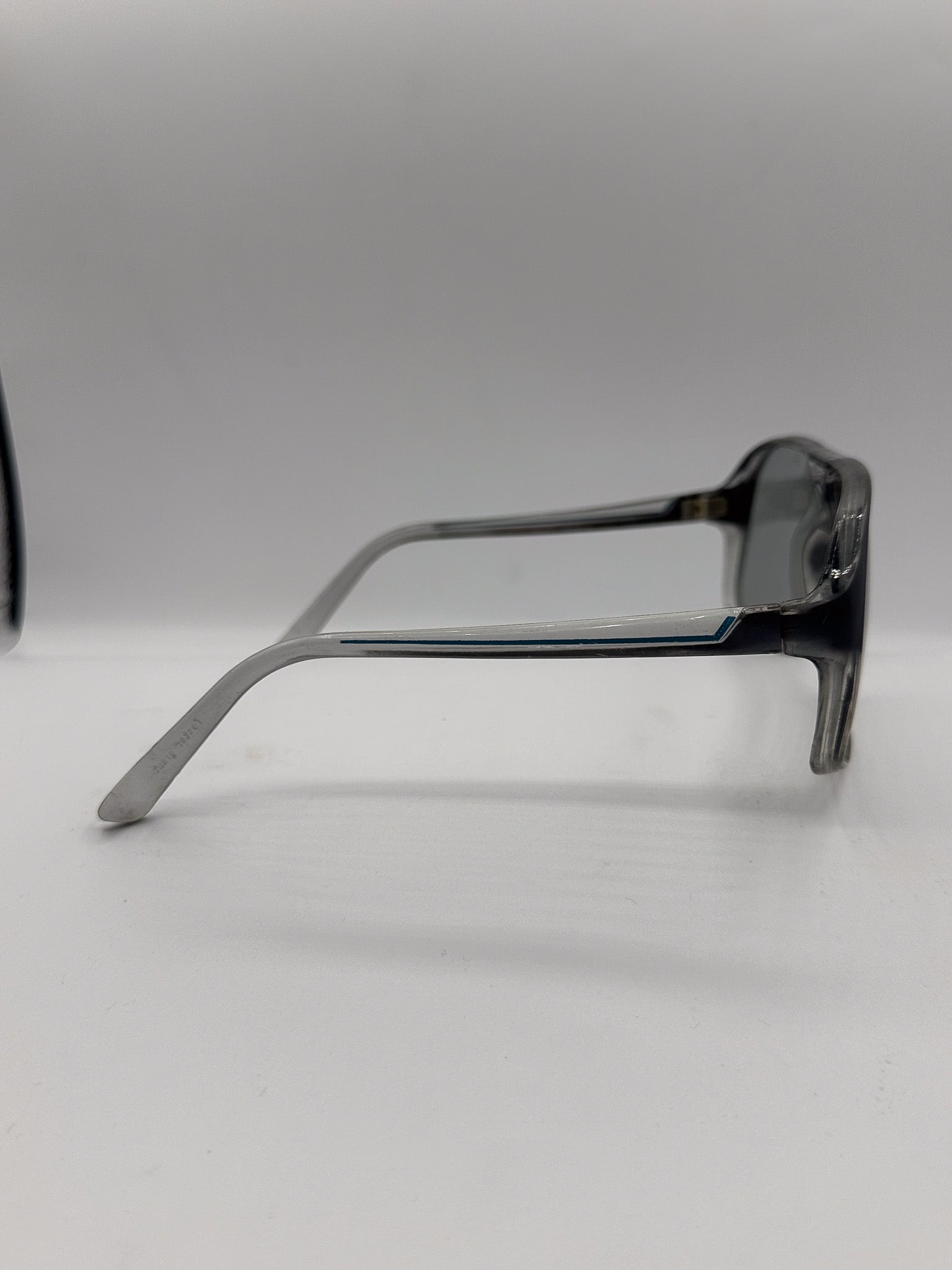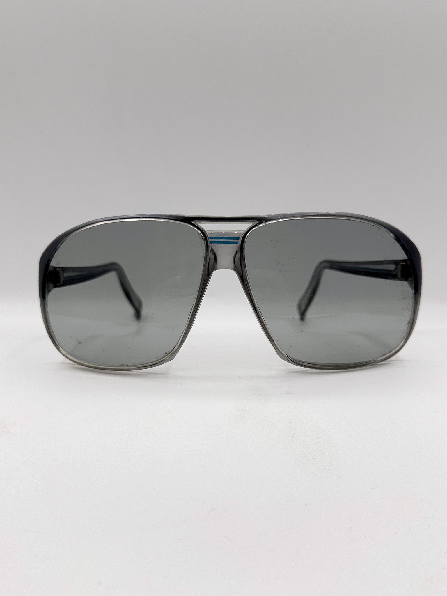 1970s vintage Foster Grant acetate frames, oversized aviator. Grey monochrome throughout with a subtle pop of blue above the nose bridge.