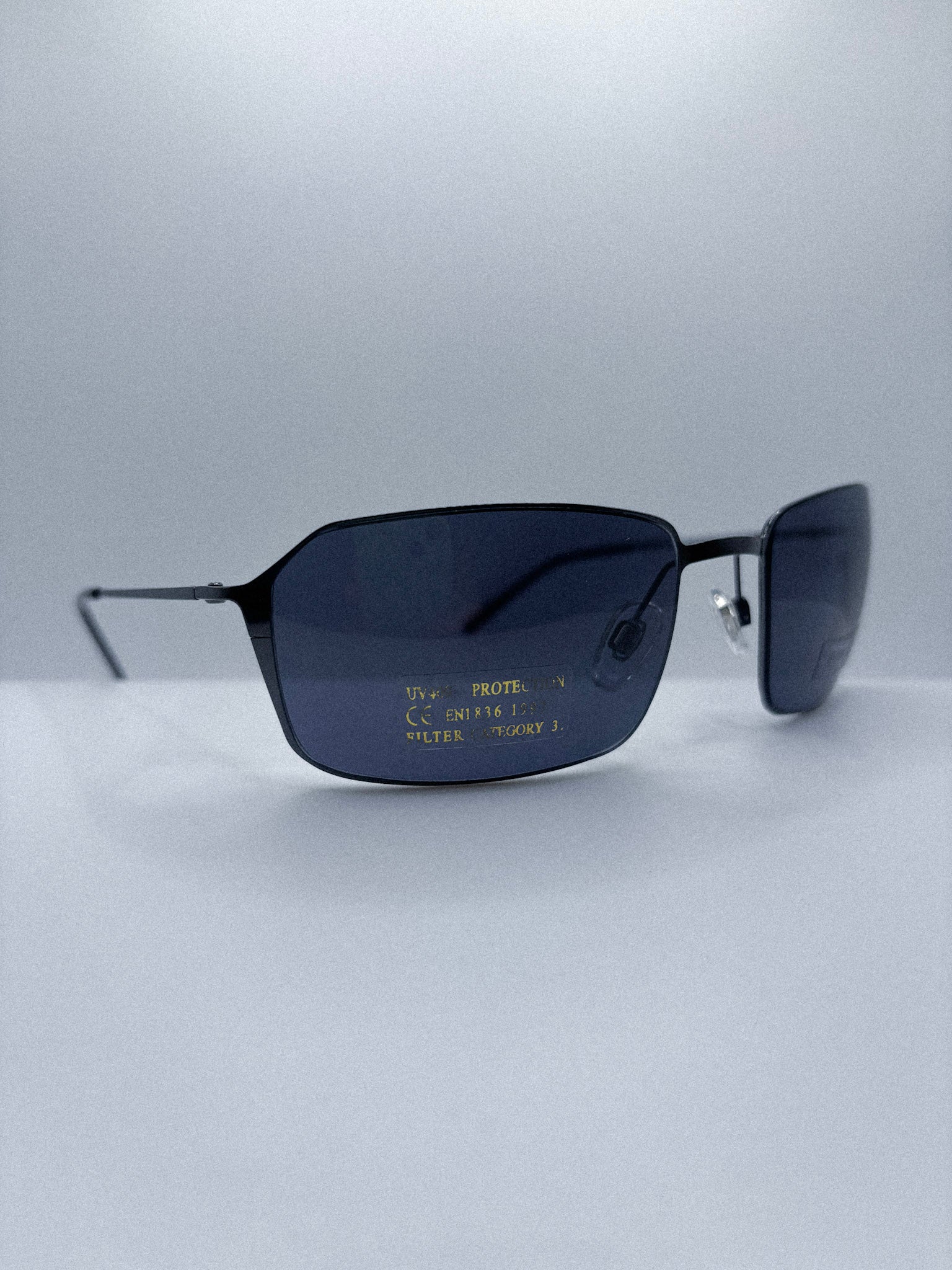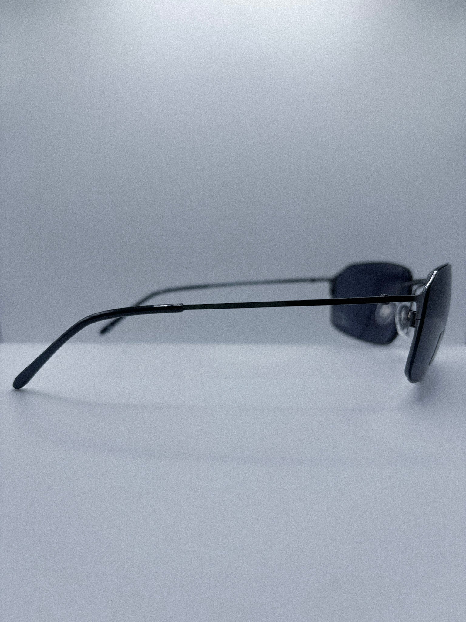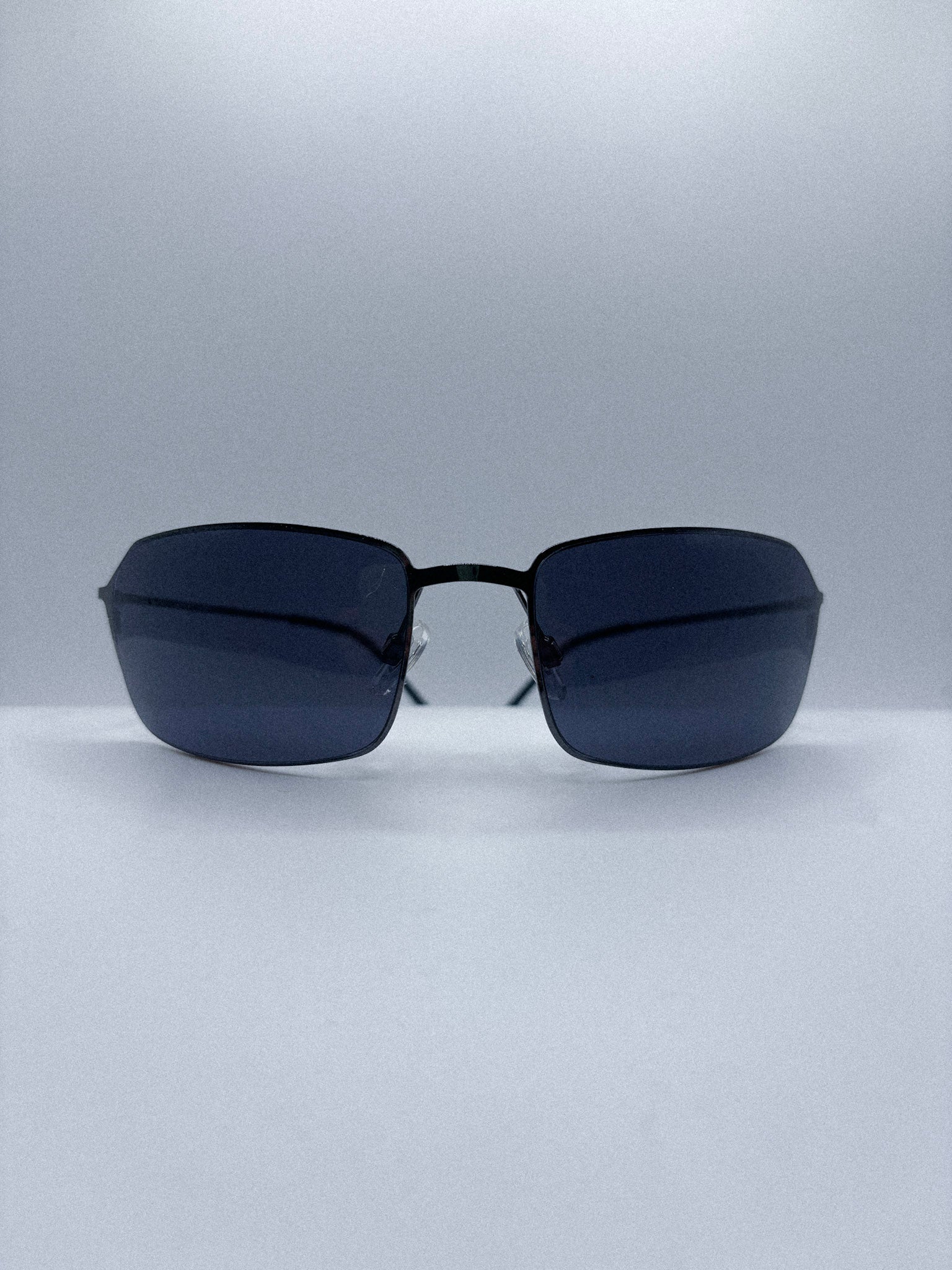 The precise rectangular cut, minimal metal construction, and deep grey lenses reflect the disciplined authority aesthetic that defined late 1990s cyber minimalism.