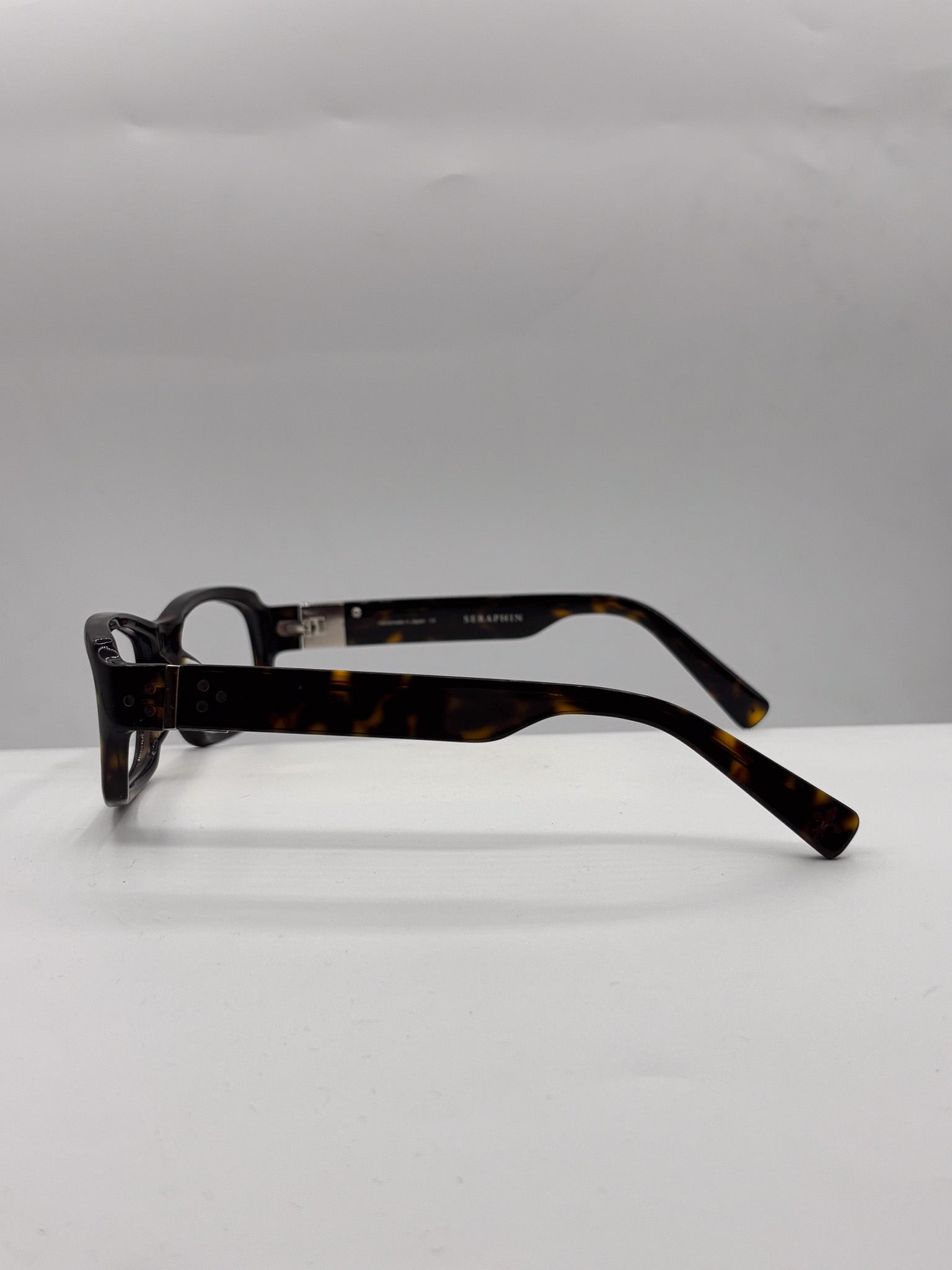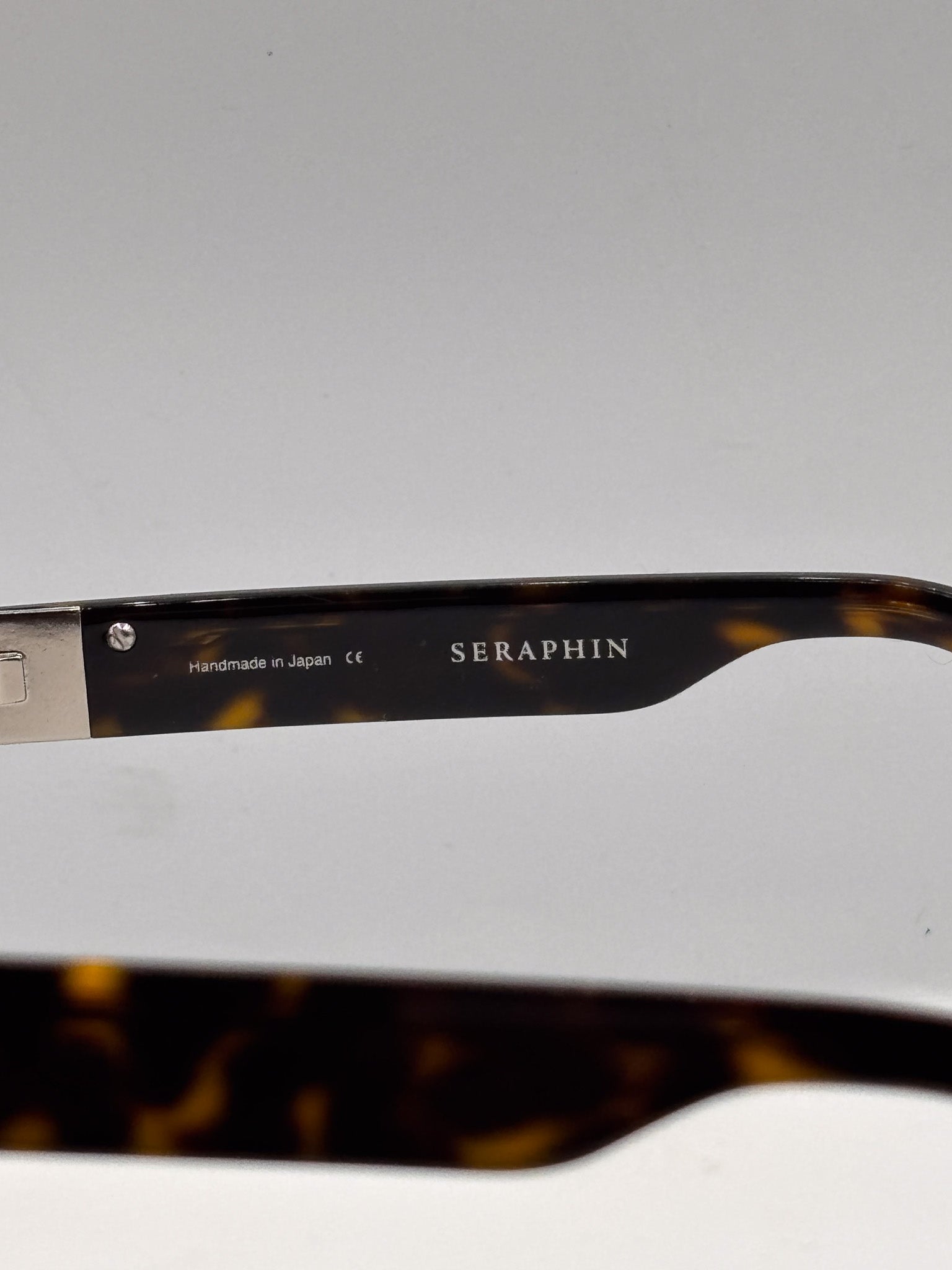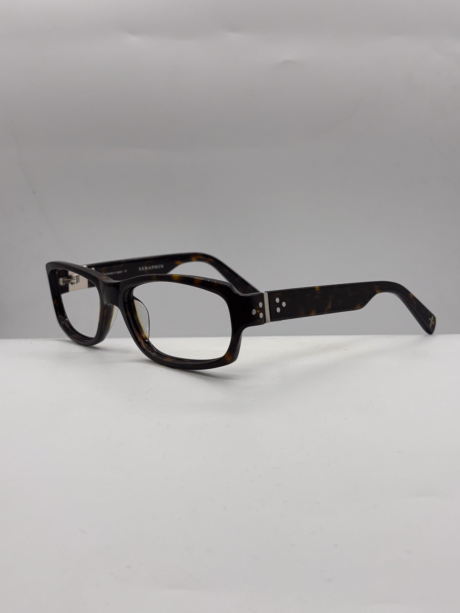Design History: Seraphin’s Japanese-made frames are known for their exquisite balance—classic shapes made with obsessive attention to proportion and polish. This rectangular silhouette, softened with a slight curve and marked by signature silver rivets, offers a subtle nod to mid-century tailoring while staying modern and sharp.