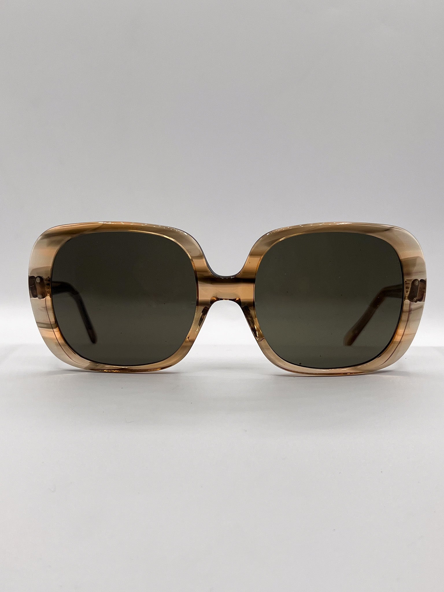 Square frame with soft edges, acetate with ribbed design & original glass lenses. Made in USA.