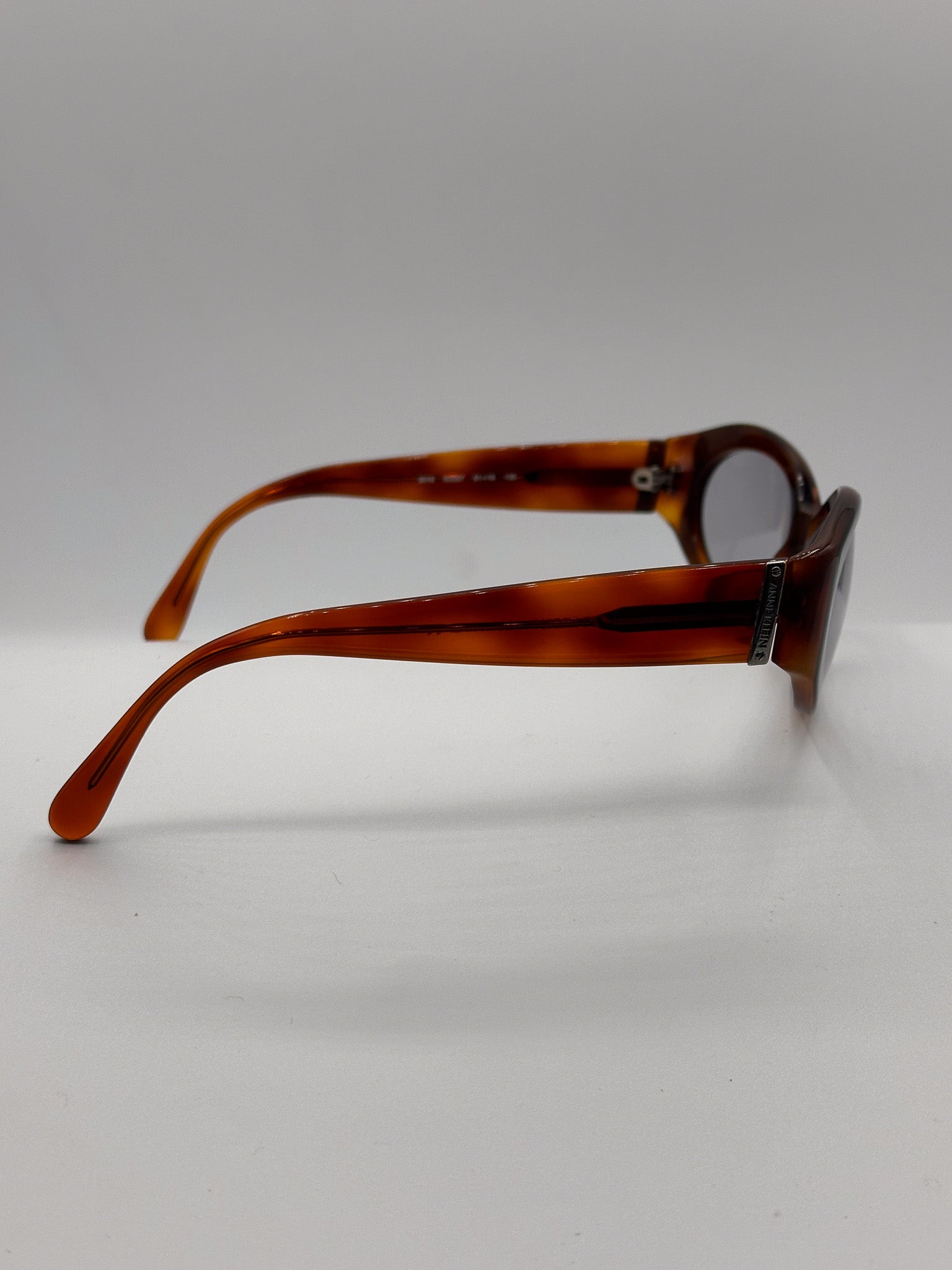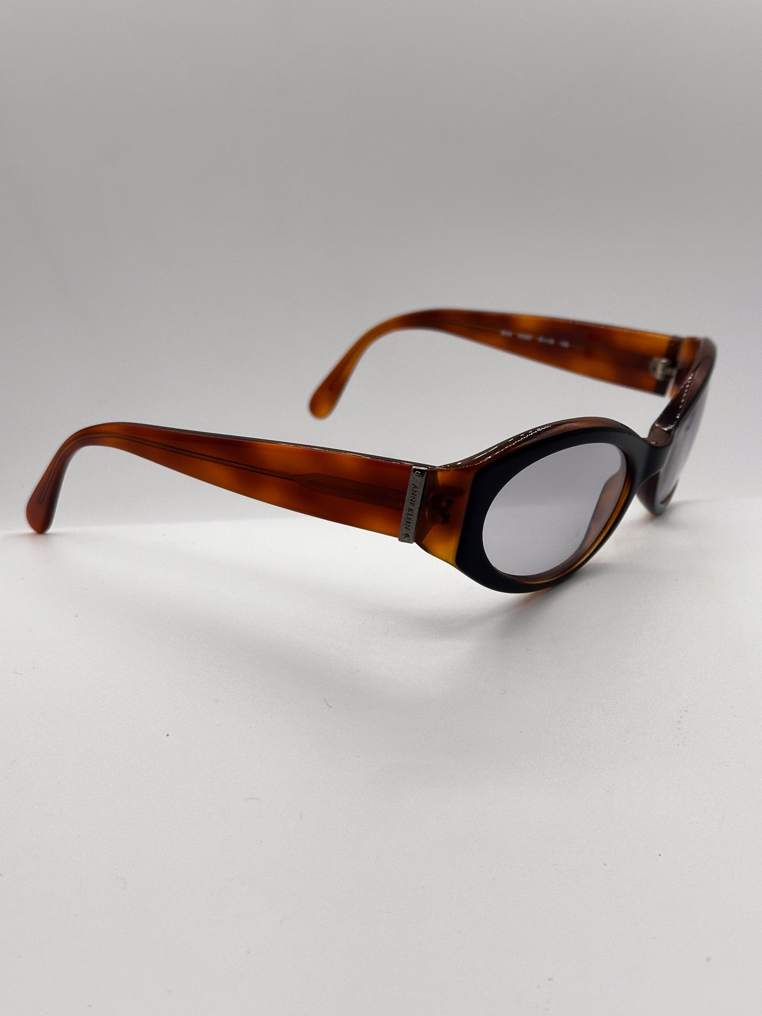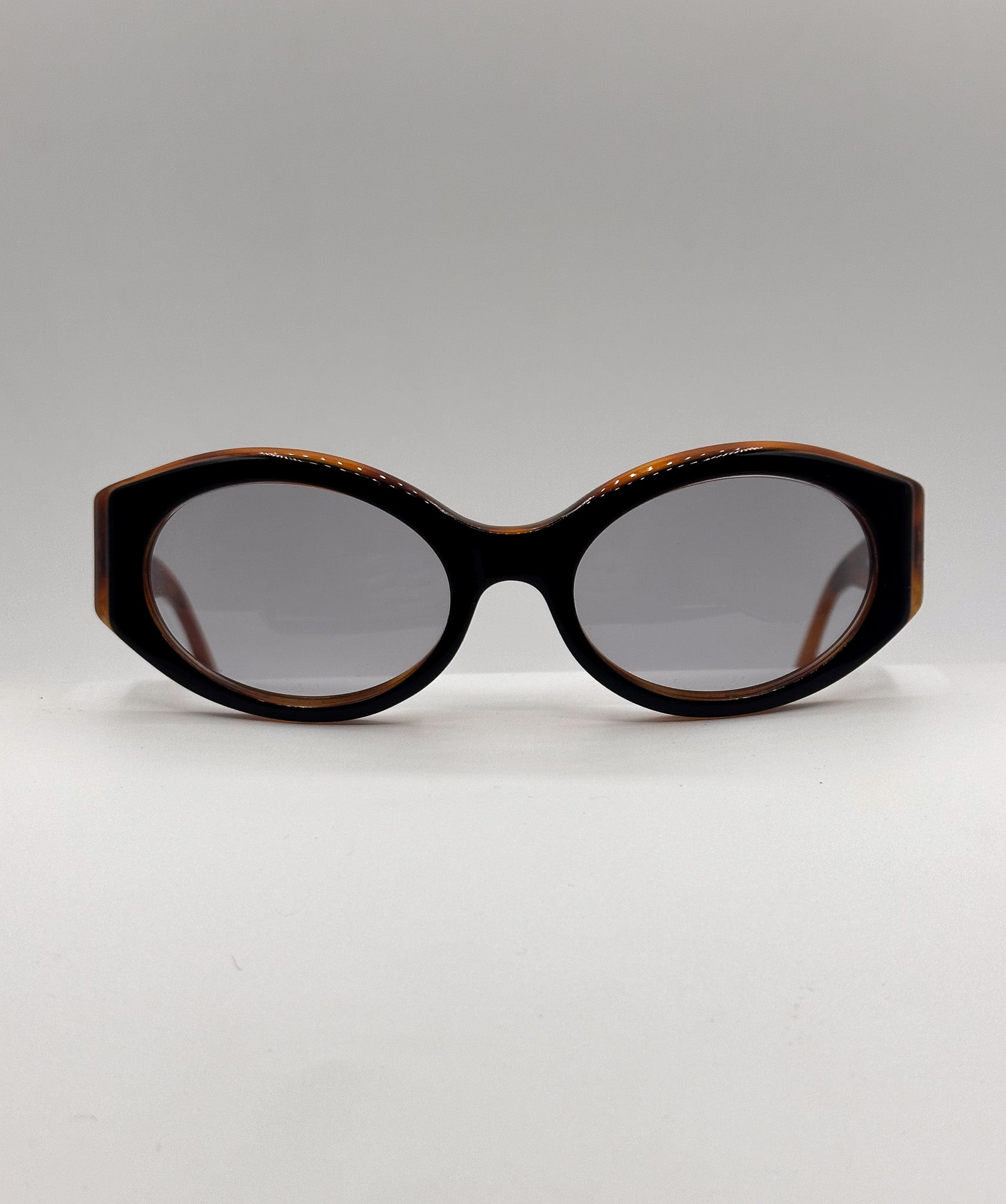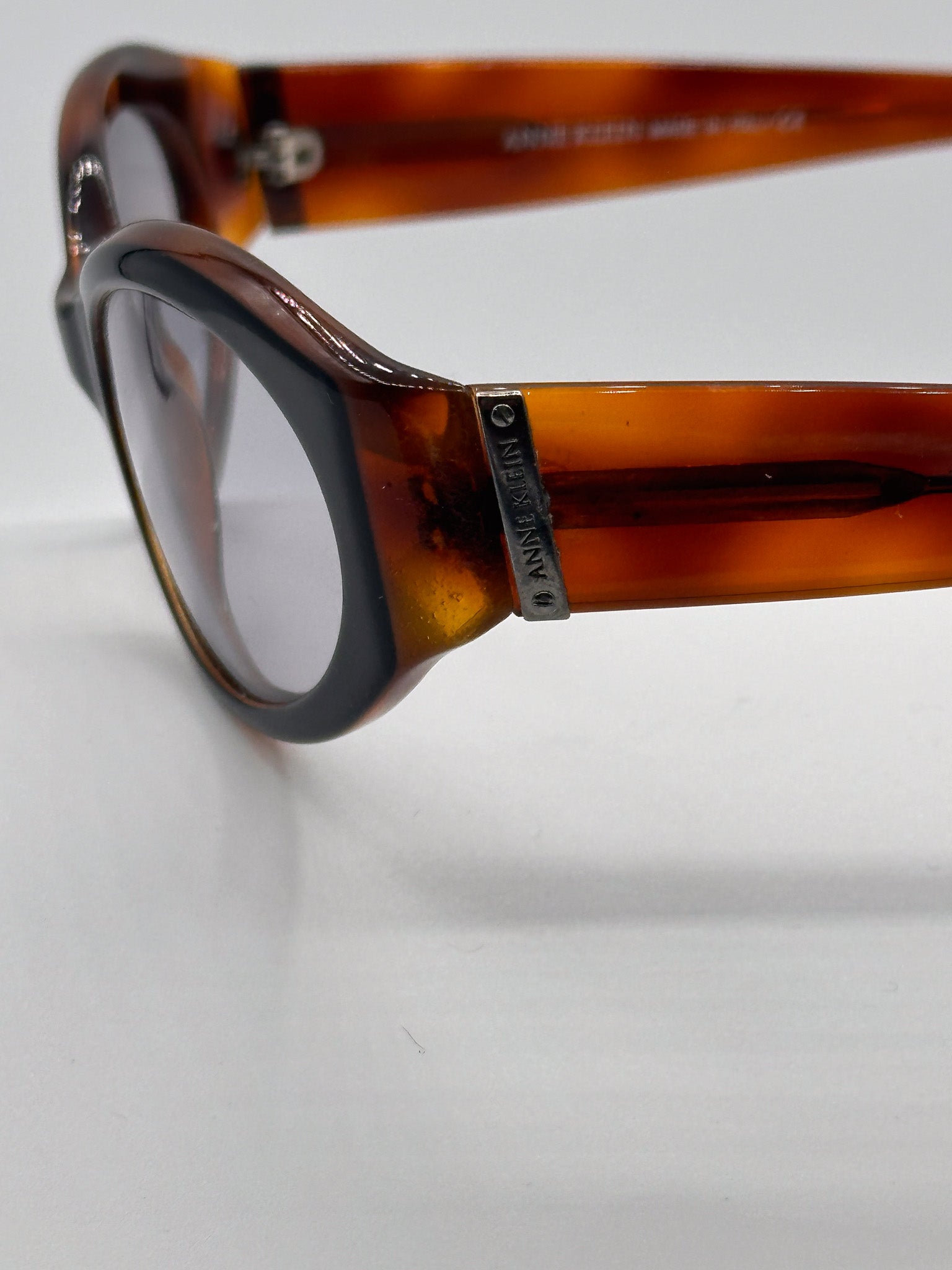1970s Anne Klein frame remodeled with smokey gray lenses. 20% tint - very light. Good for indoor/outdoor day/night transition. Orange/brown acetate tortoise ear pieces with "Anne Klein" adornment and oval black frame. Unisex.