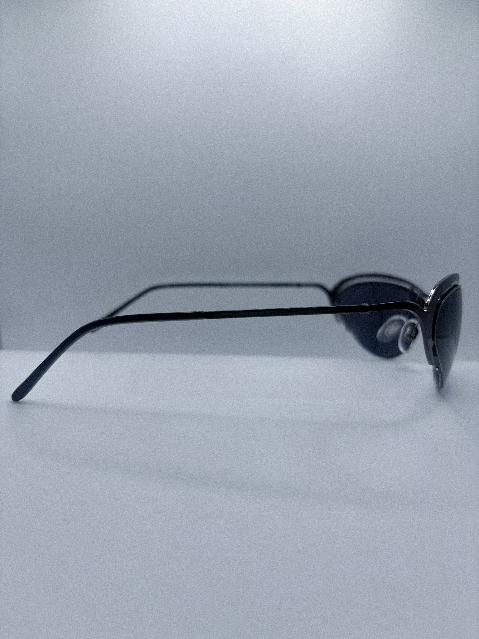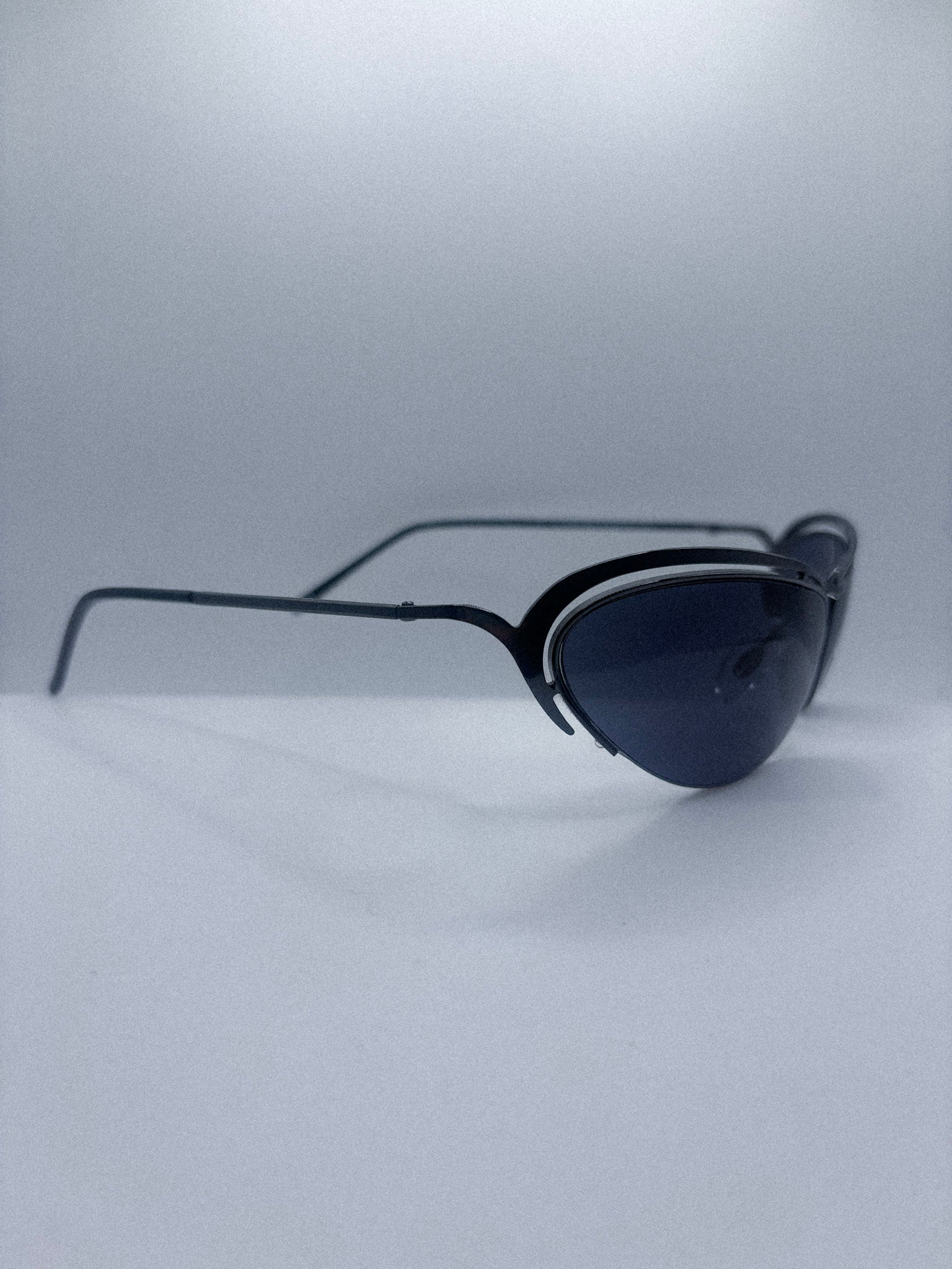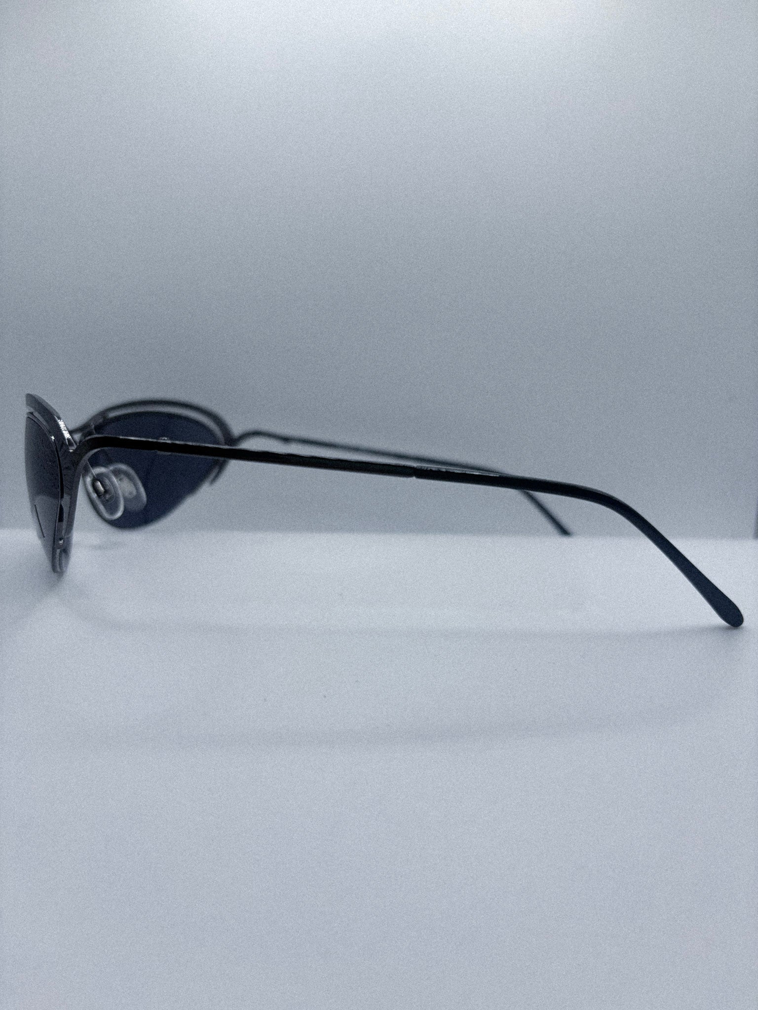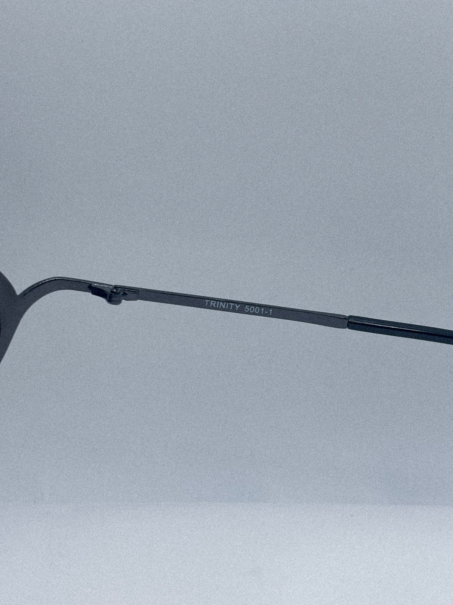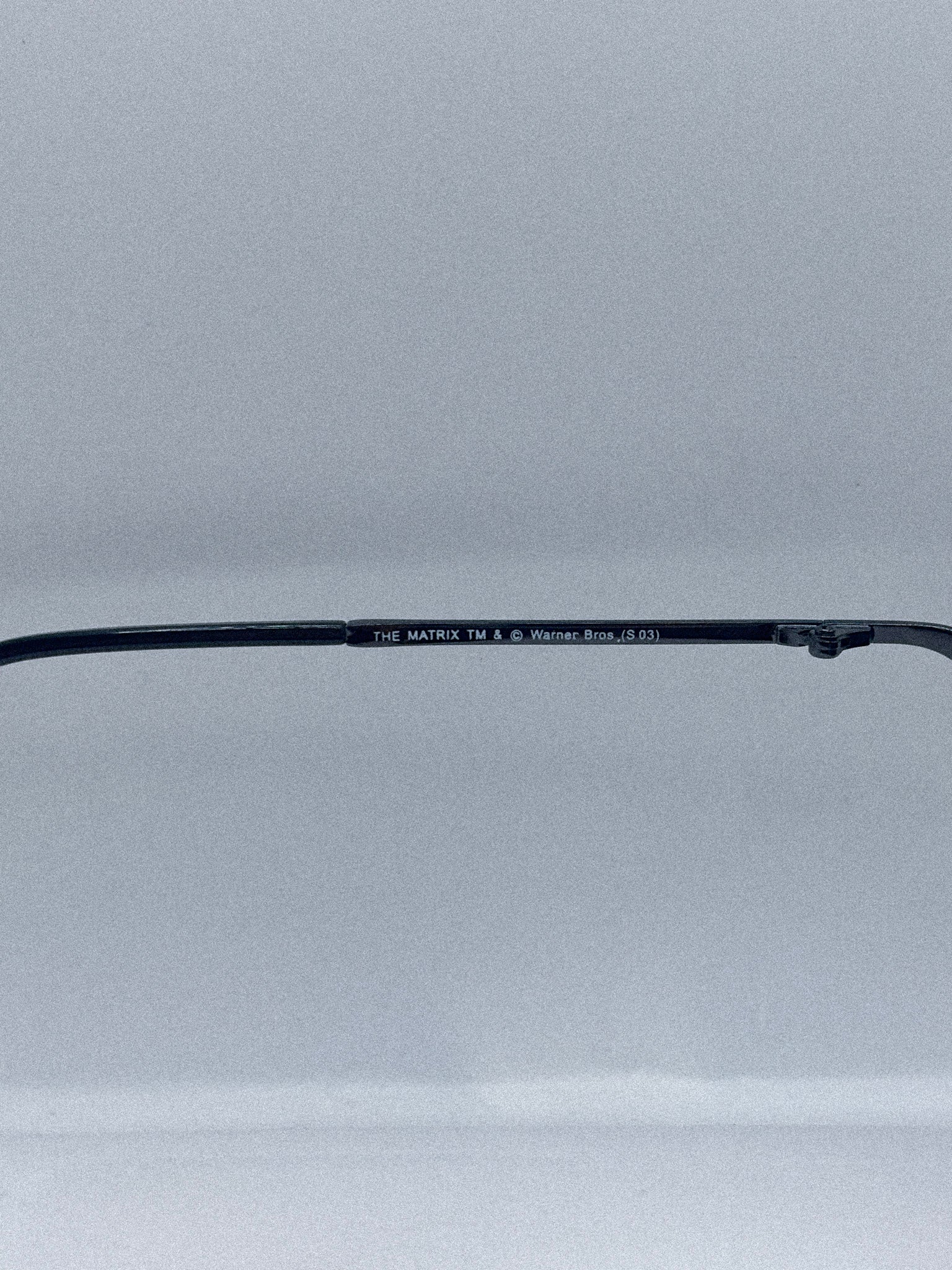 The Trinity 5001-1 is a rare early 2000s Matrix Trinity sunglasses model from the officially licensed Warner Bros collection. Featuring a narrow metal cat eye frame and dark grey lenses, this piece captures the cyber minimalism that defined late 1990s and early 2000s fashion.