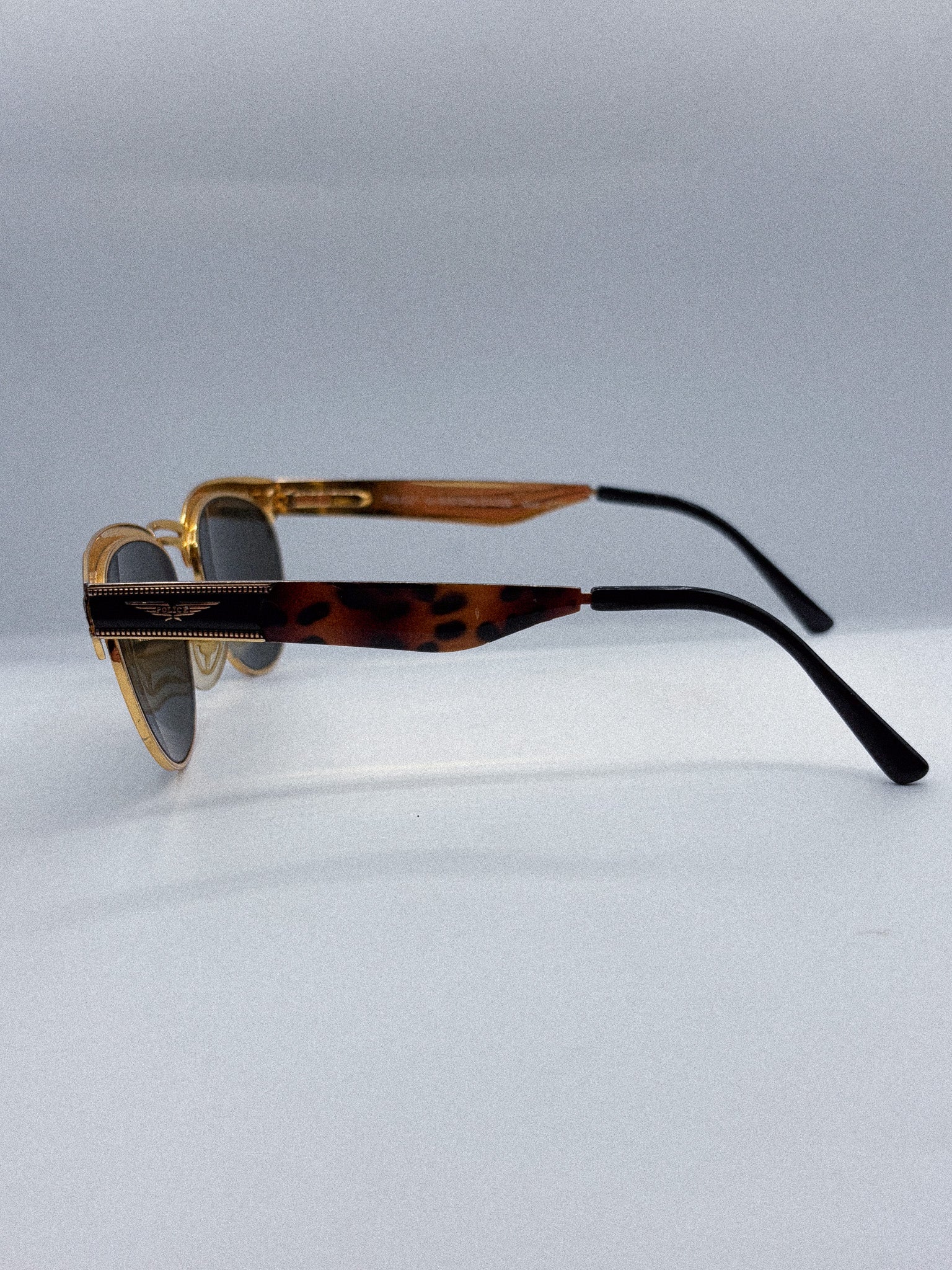 The browline design is executed in rich amber tortoise, framed with detailed gold-toned metalwork that adds just enough flash. The lenses are dark and mysterious, cutting glare while keeping secrets. It’s a style that speaks softly but always gets the last word.