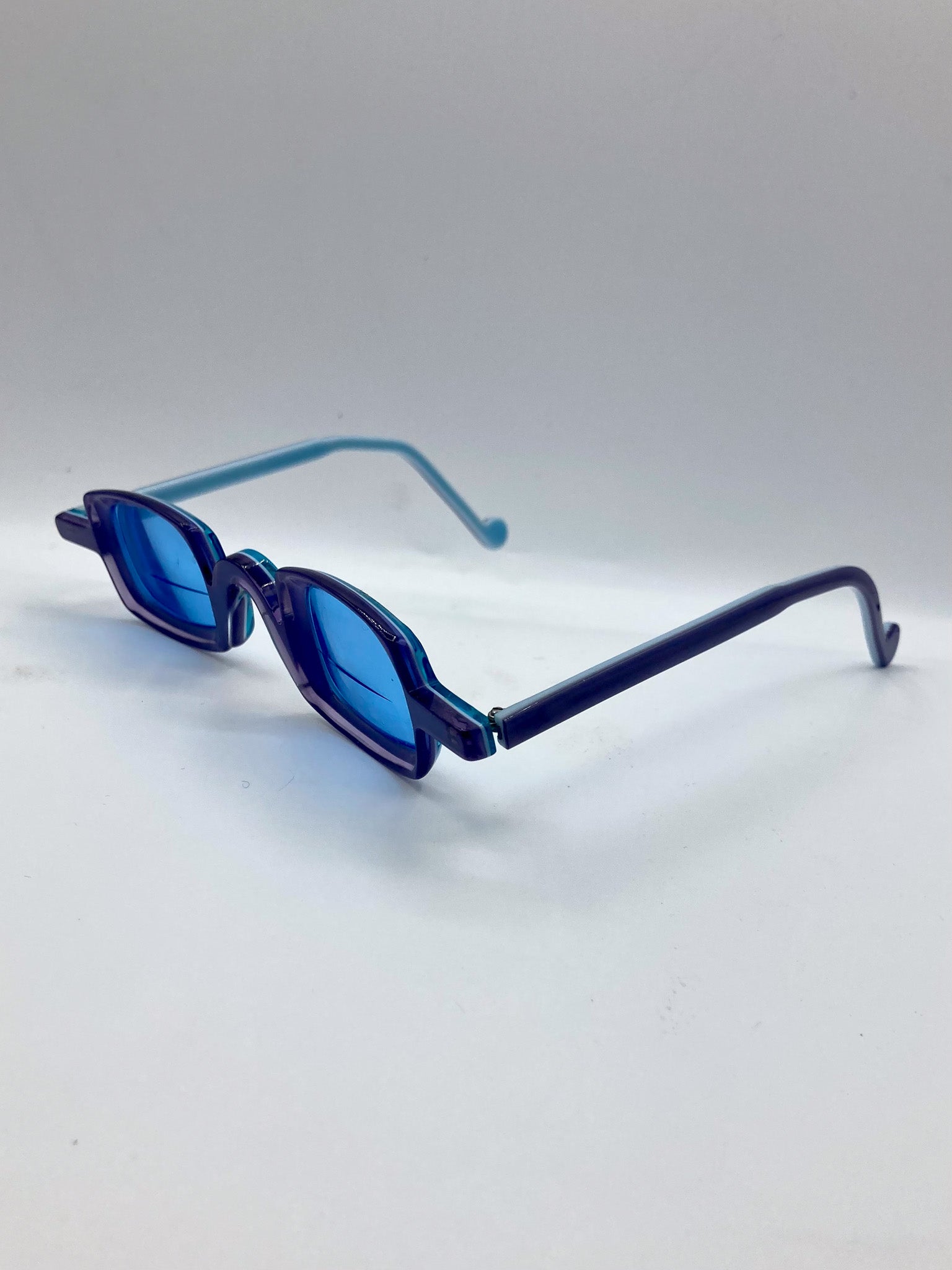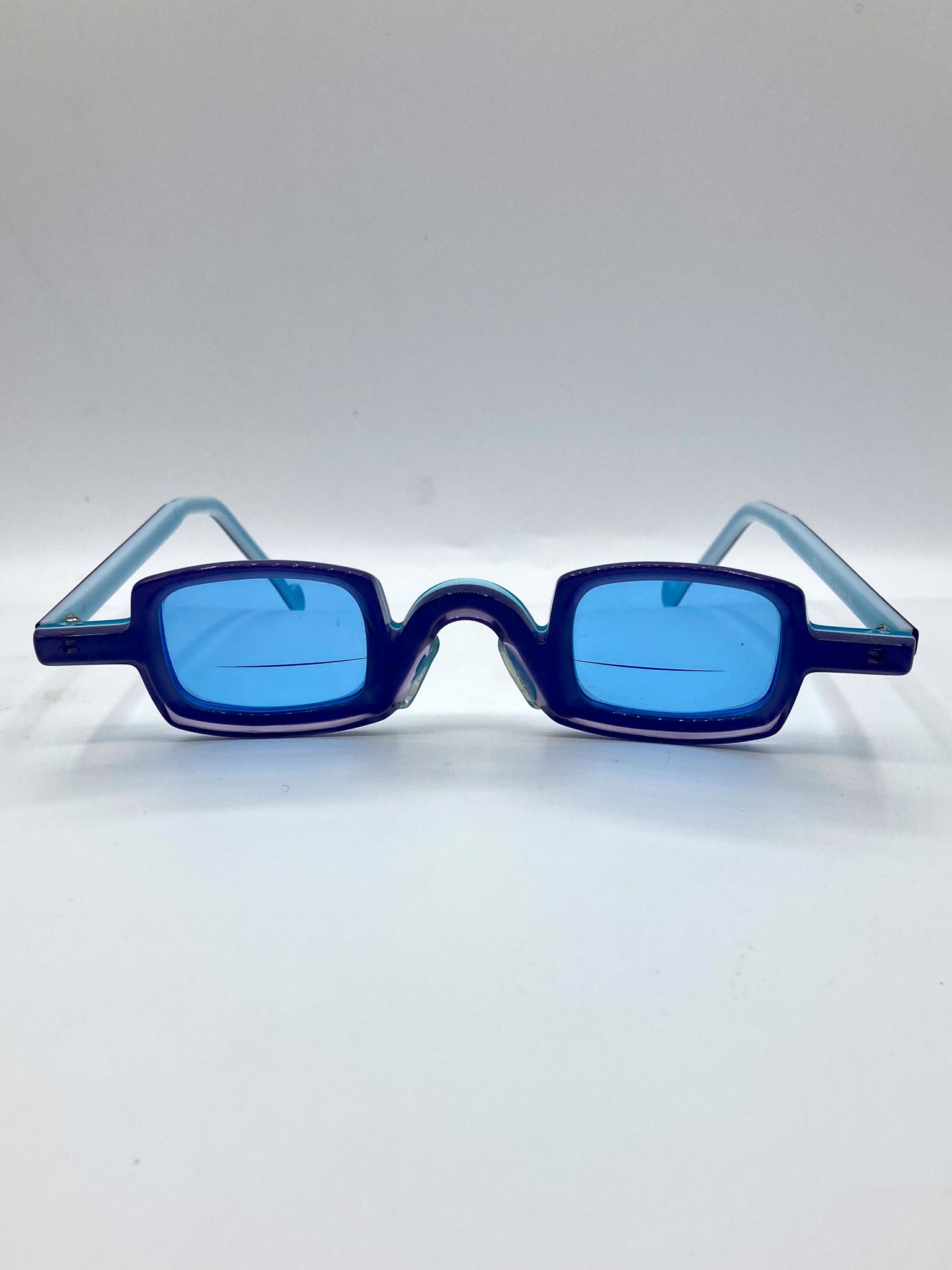 Micro square lenses with two tone violet and blue frames. Exaggerated arched nose piece and circular tips.