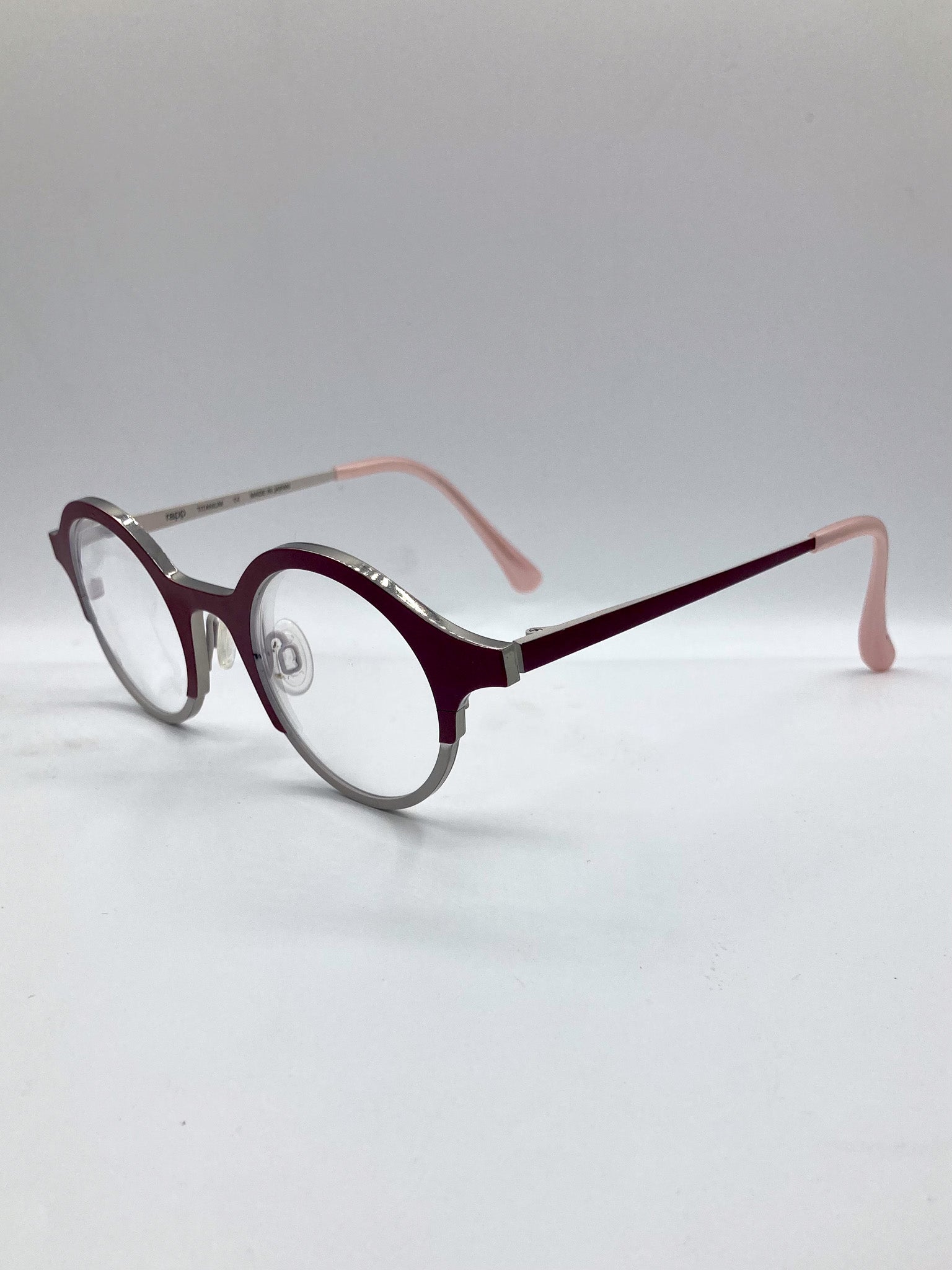 Circular lenses with titanium metal frame and a burgundy brow and arms. The glasses have a white interior and silver borders. Pearlscent pink plastic ear tips.