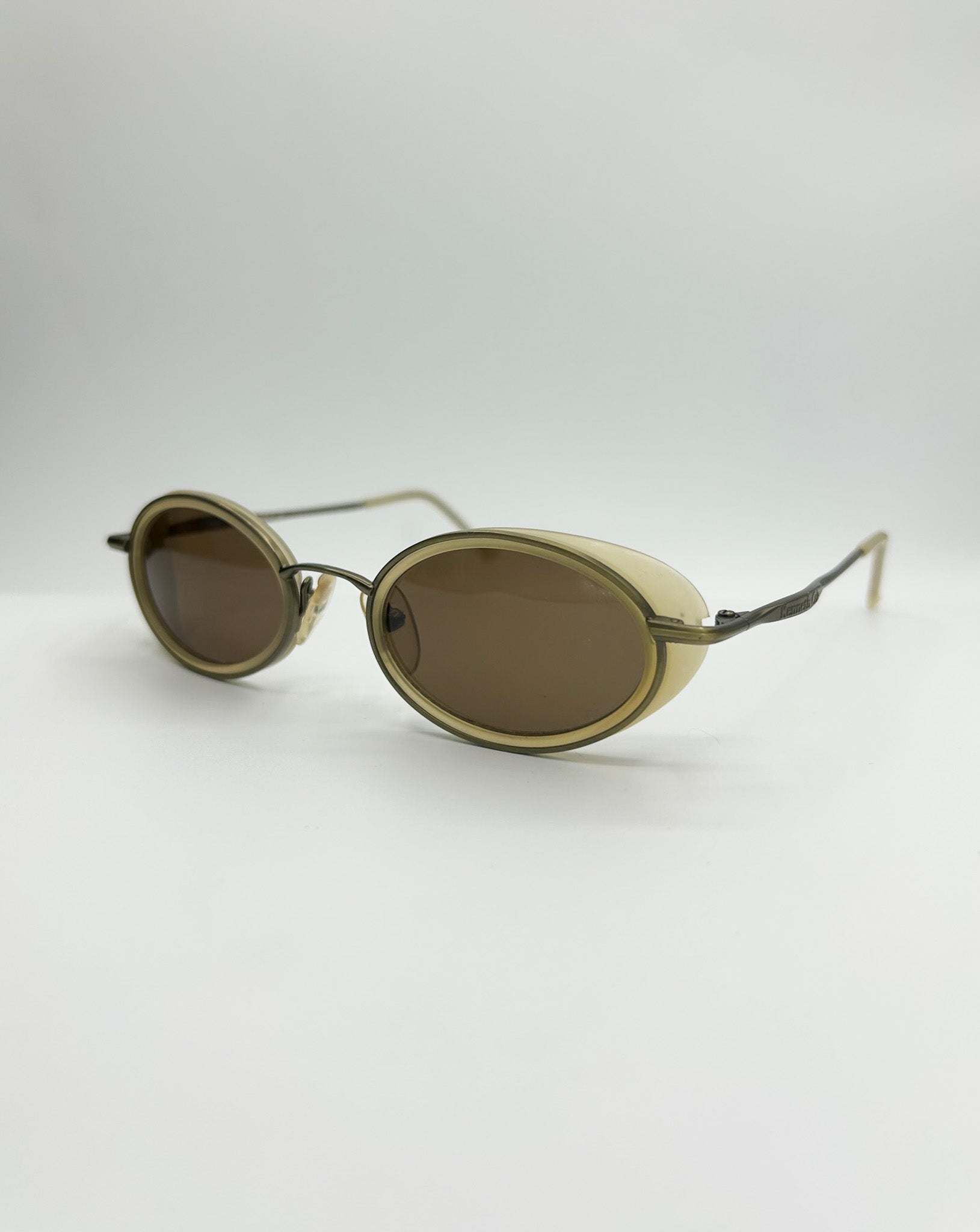 Kenneth Cole 1980s tiny oval frames with windshield on each side. Muted tones throughout — silver earpieces, gray lenses, off-white windshields. No signs of wear! Made in Hong Kong.