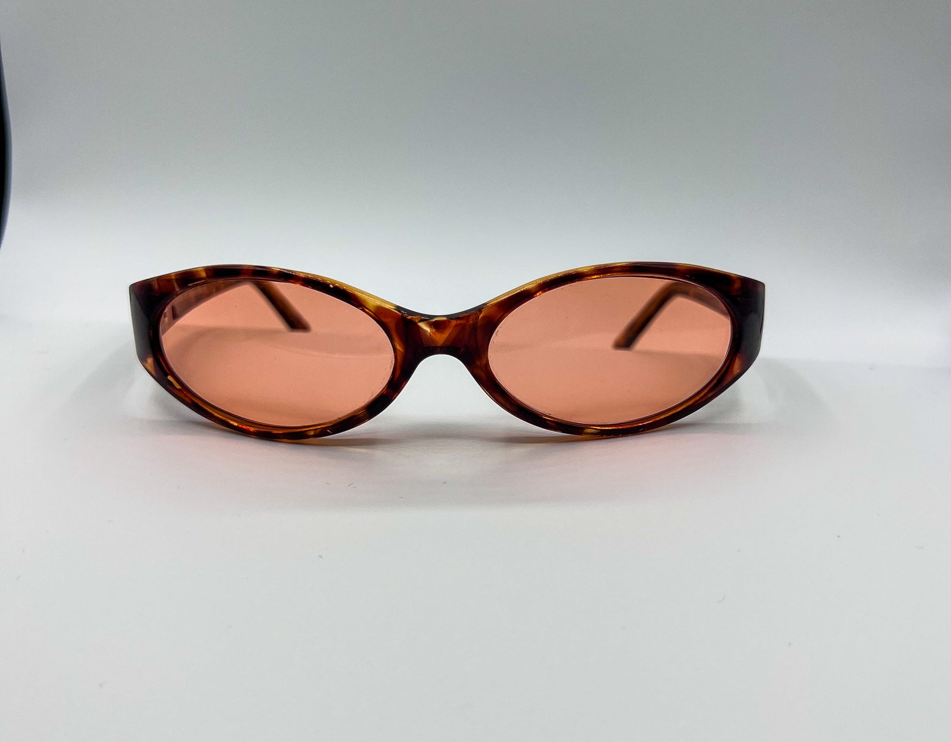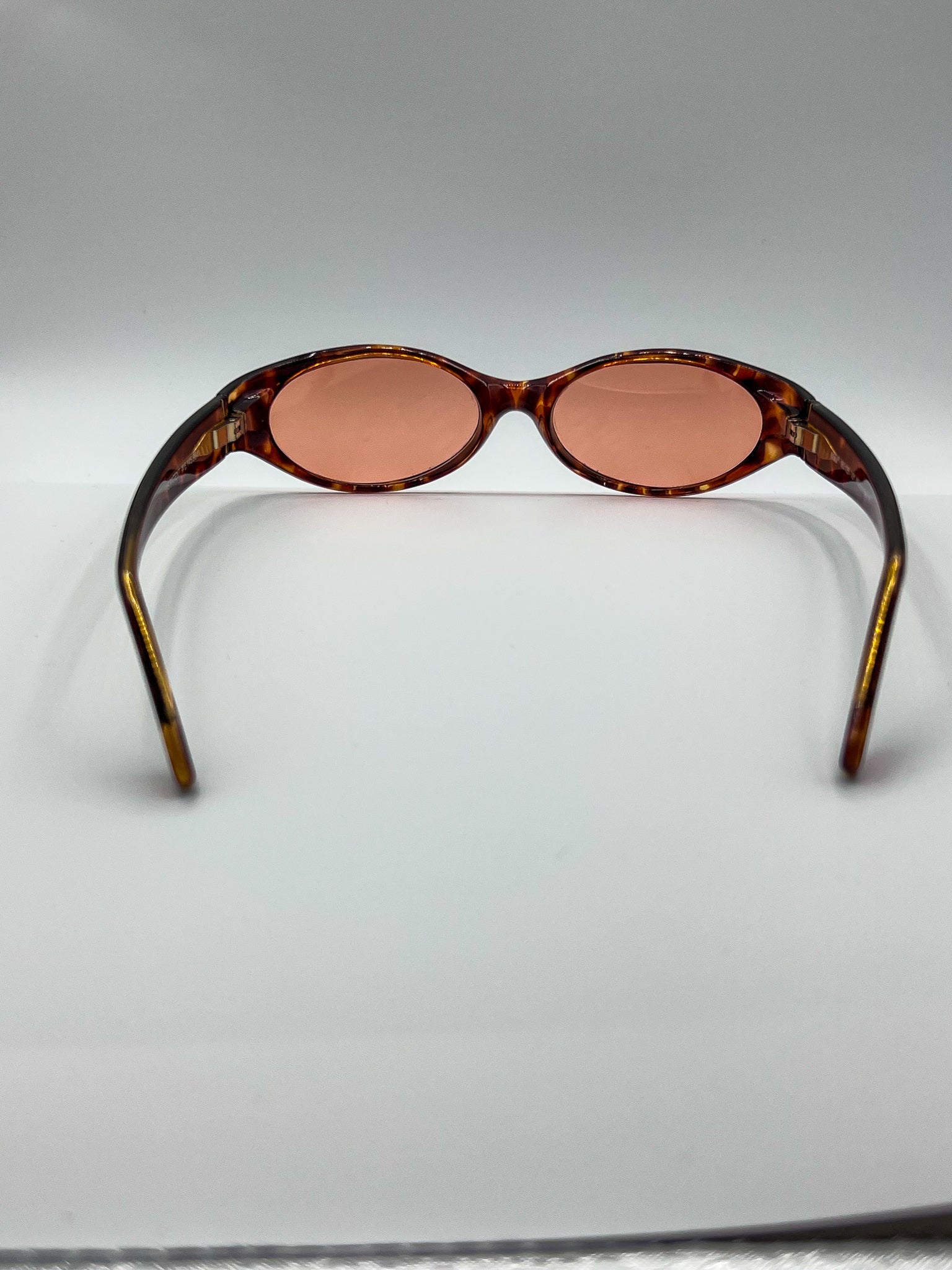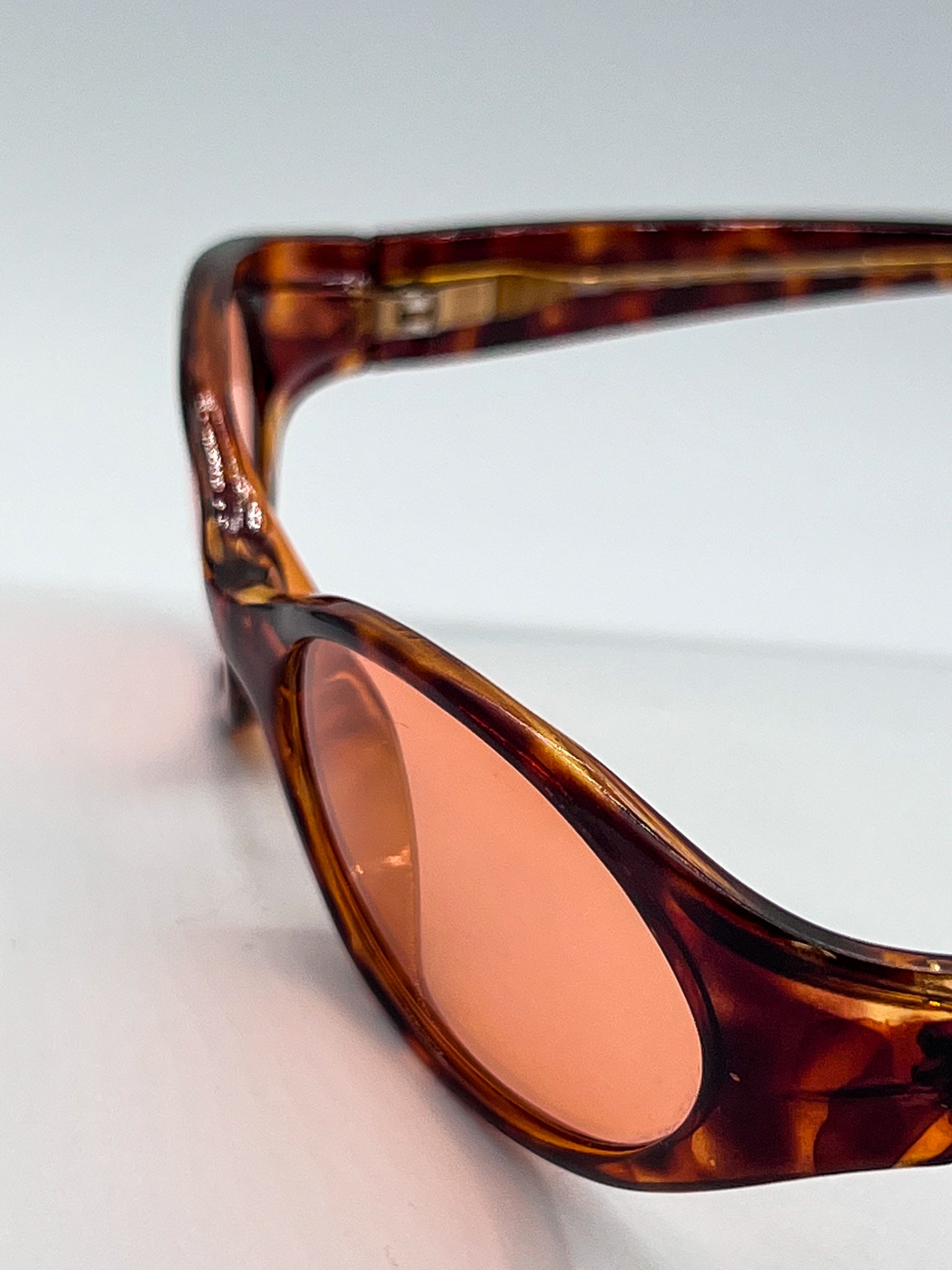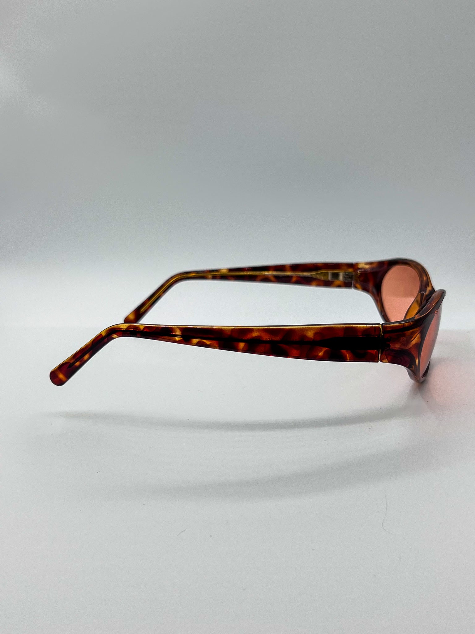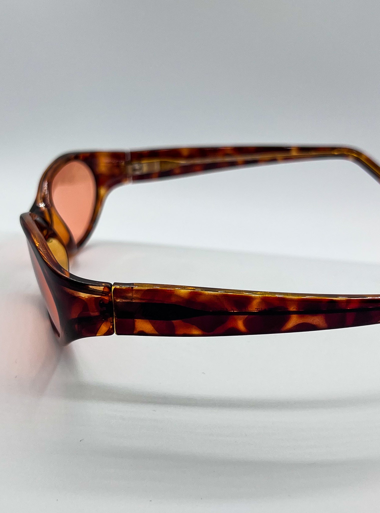 ORIGINALLY MADE IN ITALY BY JIM MAUI IN THE 1980S. SMALL OVAL LENSES WITH LEOPARD PRINT AND COMPLETE WITH ORANGE LENSES.